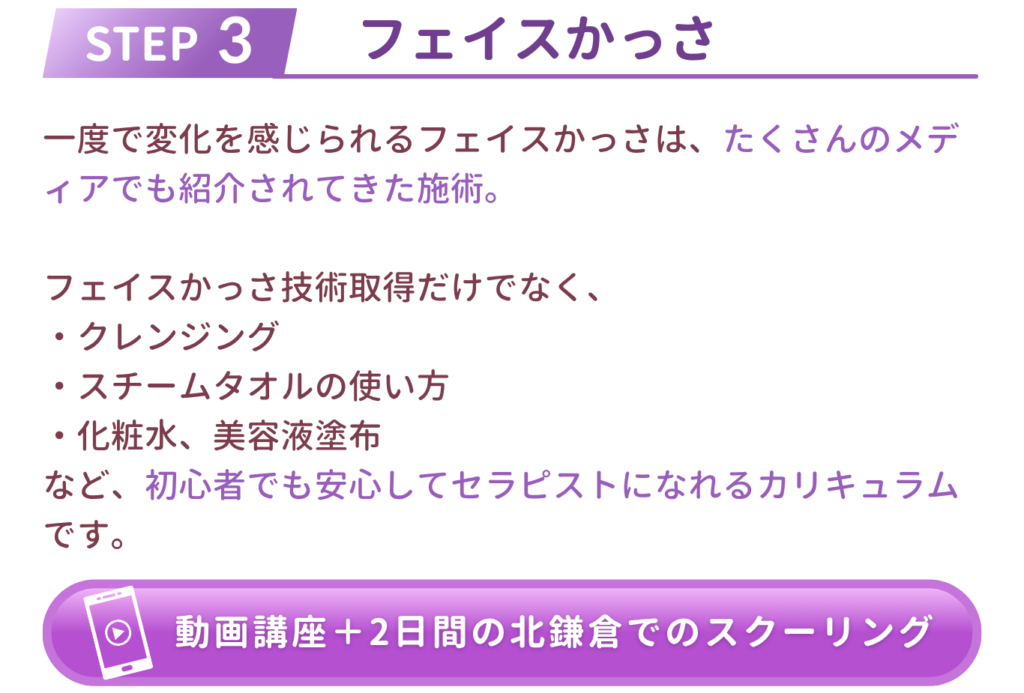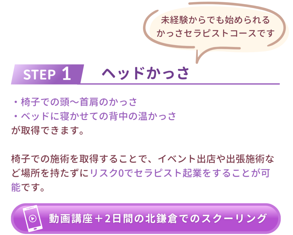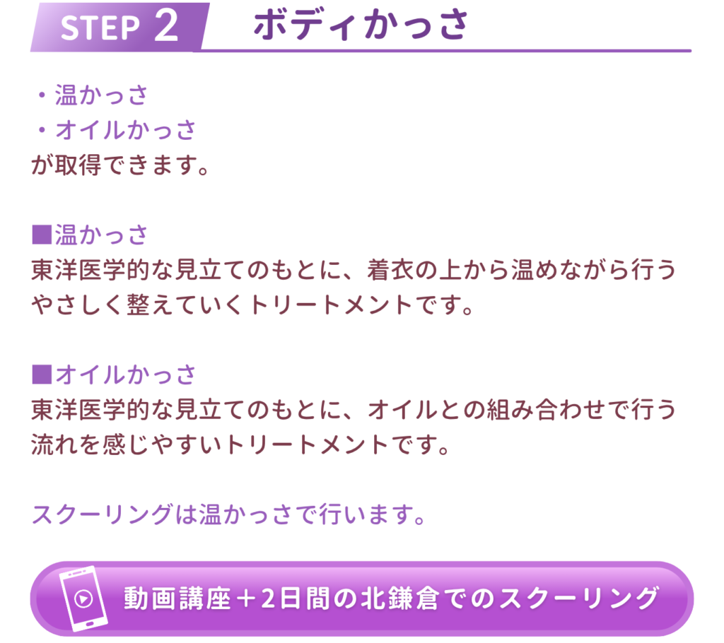 HOME > かっさセラピストコース ボディ・フェイス講座はヘッドかっさ受講後の方へご案内しています。 スクーリングの際に ご受講時期についてご相談いただけます。 開講スケジュールはこちらから 料金 お申し込みフォームはこちら \小さいサロンの作り方セミナーはこちら/ ご質問・お問い合わせはLINEからお気軽にご相談ください 公式LINEはこちら 04/14/2026 author